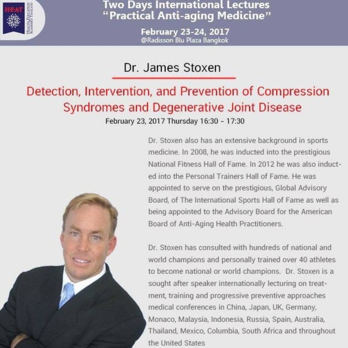 Dr James Stoxen DC, FSSEMM (hon) FWSSEM gave the presentation, “The Integrated Spring-Mass Model for the Earliest Detection Intervention and Prevention of Thoracic Outlet Syndrome” at the 9th Annual A4M Thailand Congress on Anti-aging and Aesthetic Medicine, Bangkok, Thailand, 2017